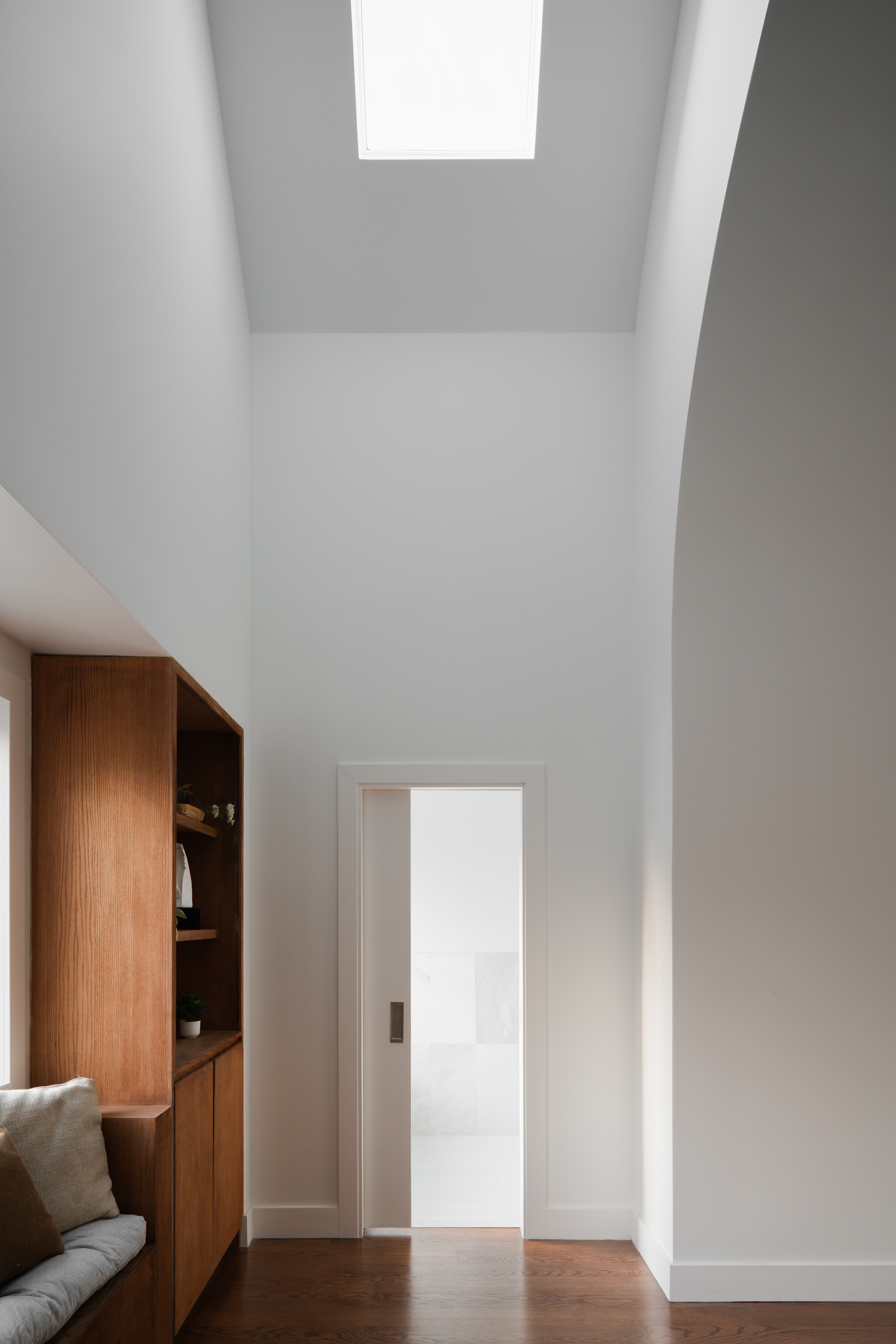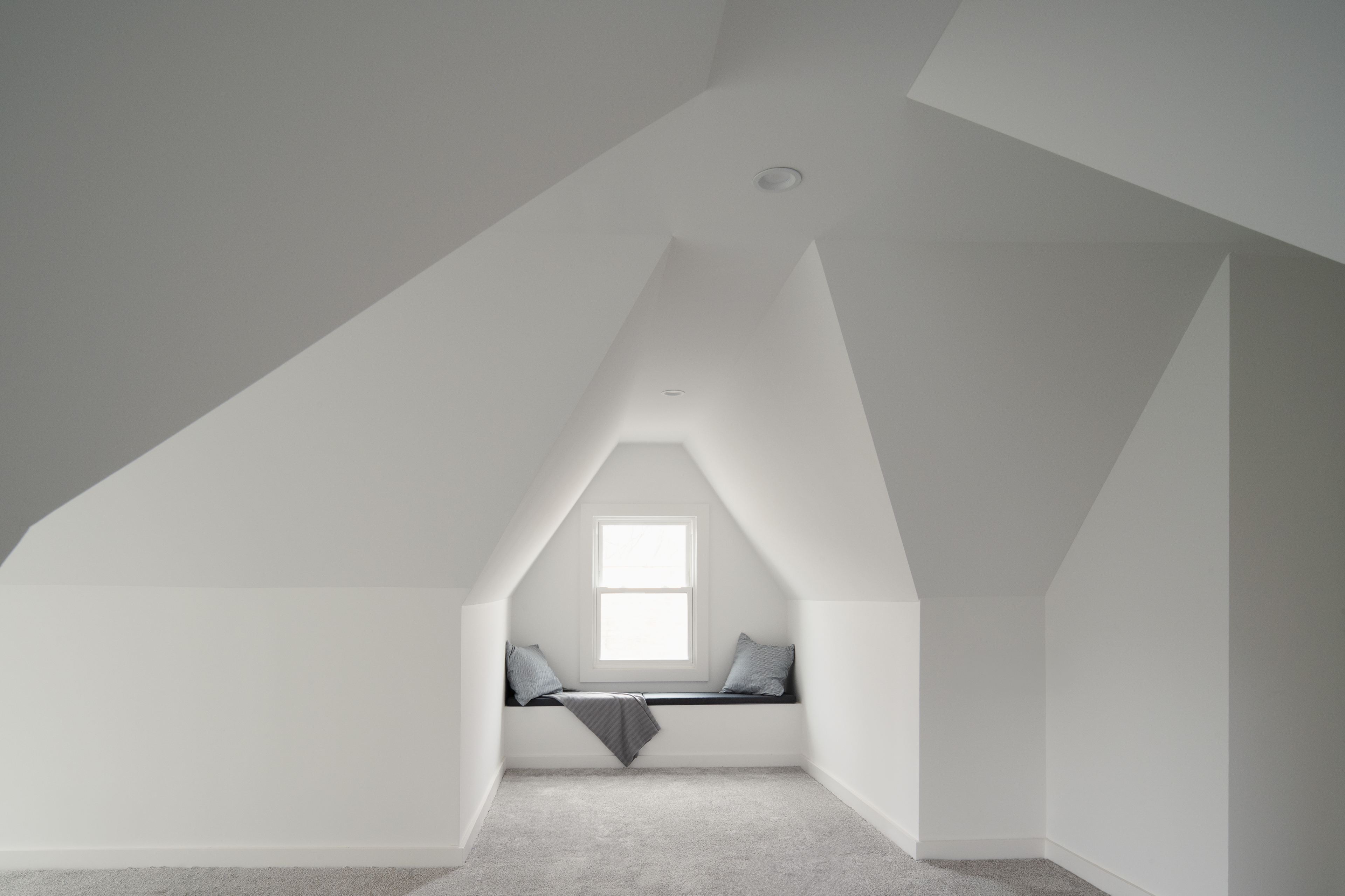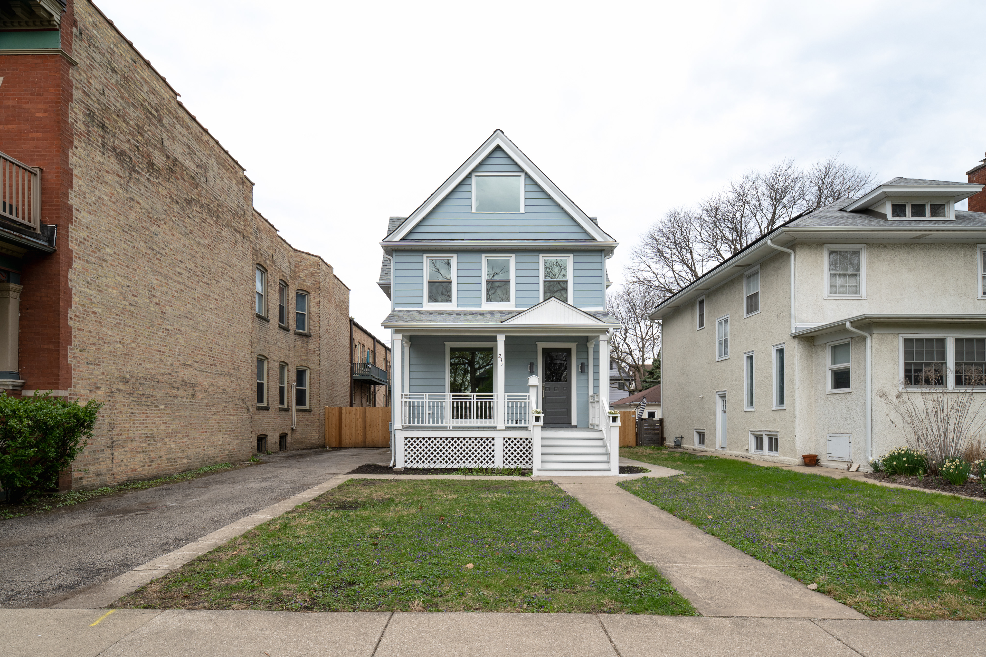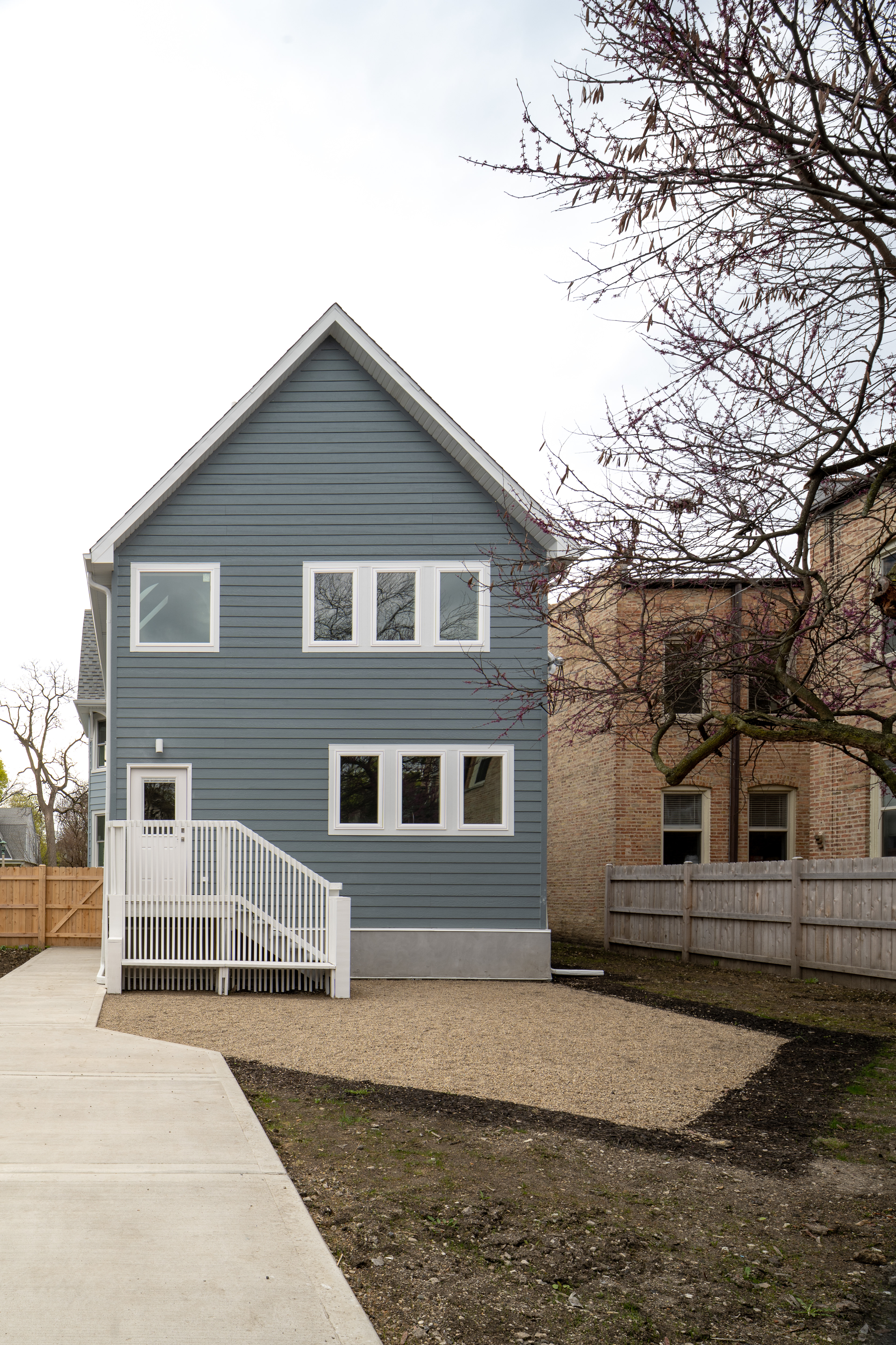 The Blue House, a Queen Anne dwelling that predates the Prairie Style, stands as the eldest on its block in Oak Park's Ridgeland Historic District. Born in 1886, it has carried the stories of generations, its walls marked by the passage of time. At the street, Victorian details—trim, balusters, doors, and brackets—are preserved and revived, a nod to its historic grace. To the rear, a new addition unfolds, opening the first and second floors to the rhythms of modern life. Within, a soaring geometric cathedral ceiling draws light through fresh skylights, casting shifting patterns that invite new rituals and gatherings to take root in an old home, reborn.