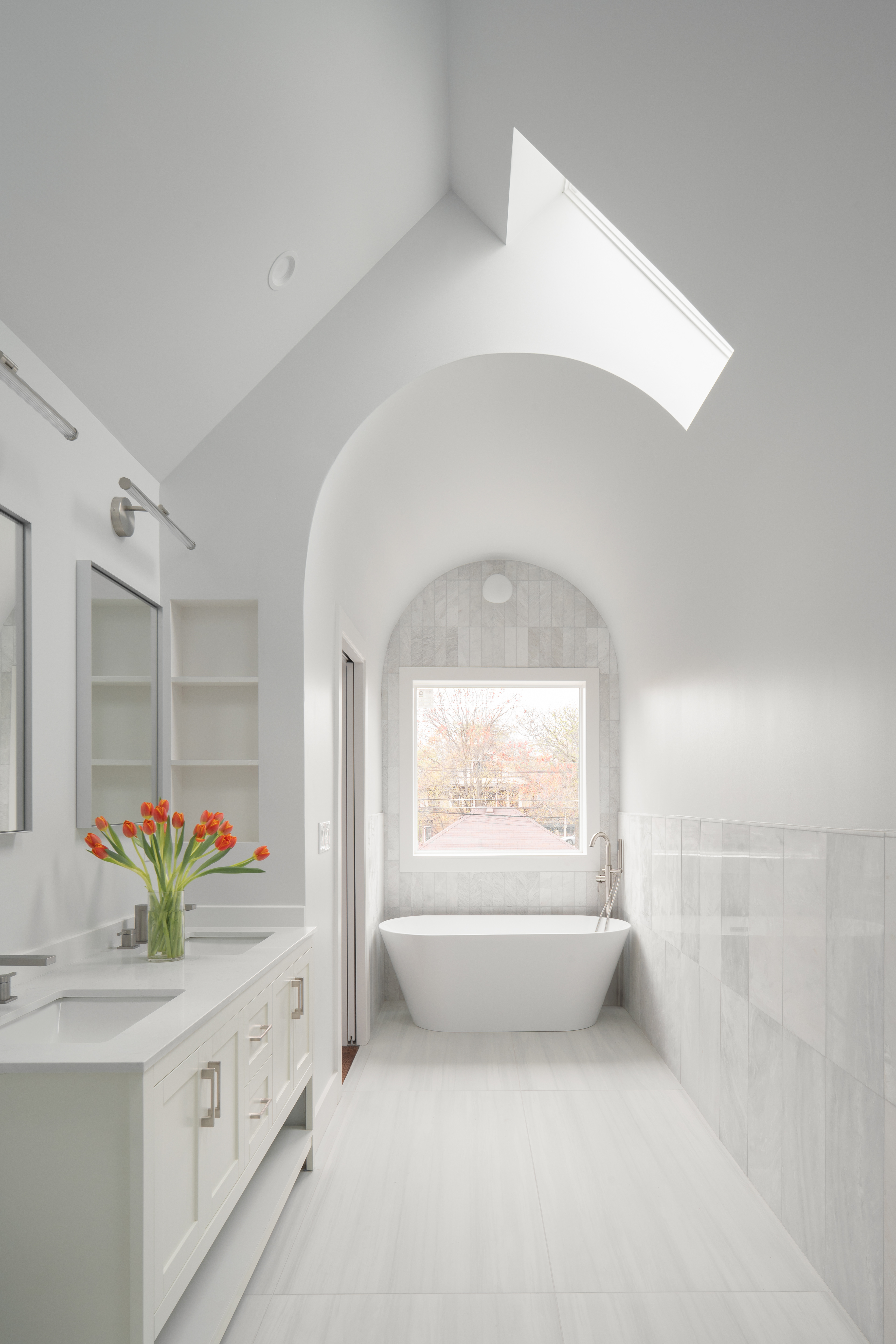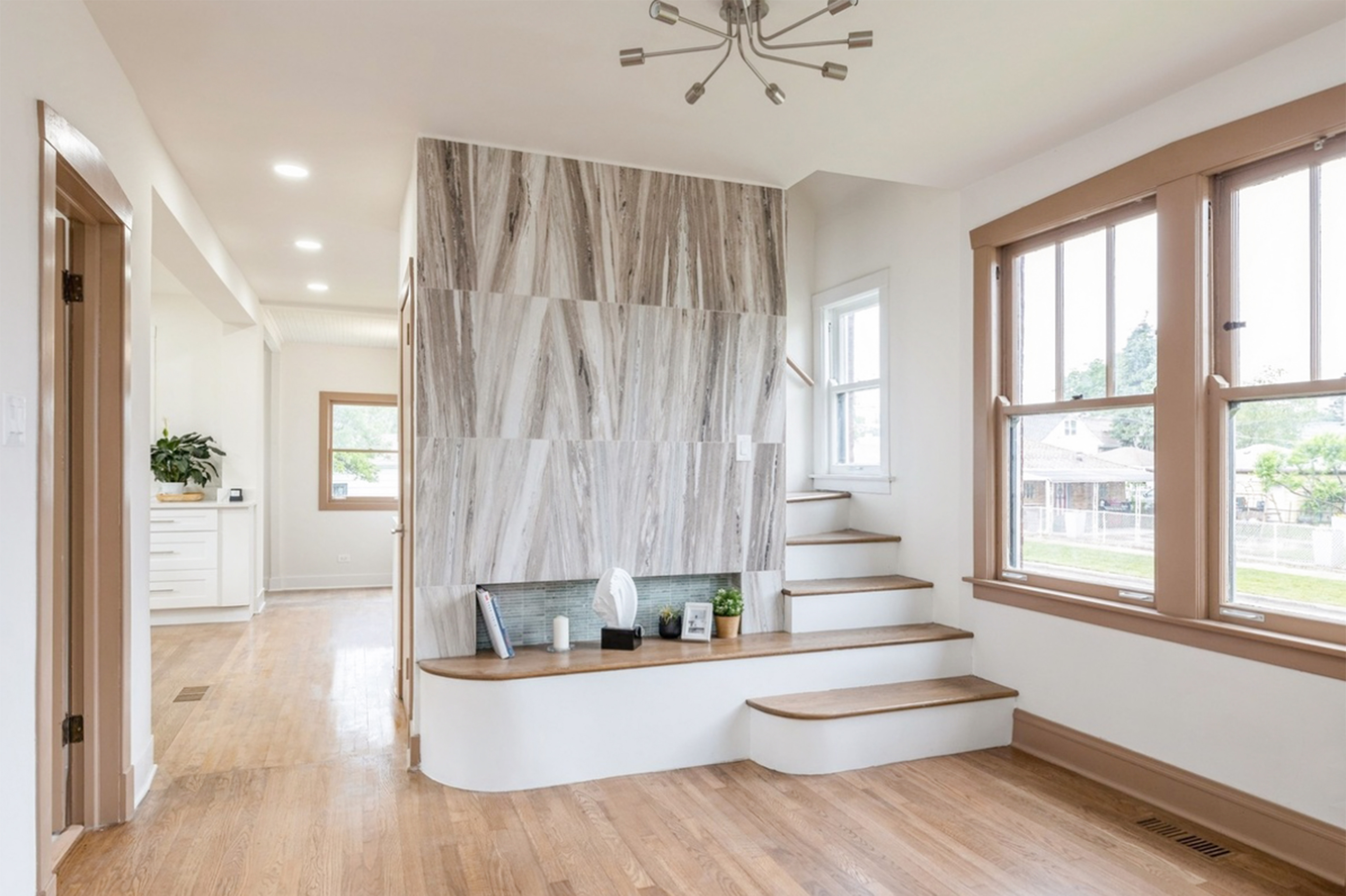 In the heart of Berwyn, we reimagined a 1923 brick bungalow into a cozy, contemporary home tailored to modern family living. The transformation centers on a craft-inspired tiled fireplace set before a new living room stair, blending elements of Art Deco with the warmth of the Arts and Crafts movement. A refined and tightened floor plan introduces both efficiency and comfort, maximizing every square foot of the 2,300 SF home while preserving its historic character and adding a distinct architectural identity.
